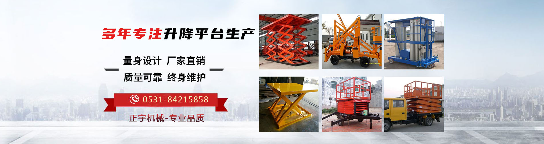濟(jì)南正宇升降機(jī)械有限公司是一家集設(shè)計(jì)、研發(fā)、生產(chǎn)和銷售于一體的制造型企業(yè),生產(chǎn)液壓升降機(jī)械和高空作業(yè)平臺(tái),公司處于素有泉城美稱的山東省濟(jì)南市,坐落于濟(jì)北開發(fā)區(qū)。優(yōu)越的地理位置和便利的交通給公司的發(fā)展帶來了充分的條件。正宇液壓技術(shù)力量厚,工藝流程先進(jìn)合理,檢測手段齊全。目前主要產(chǎn)品有:高空作業(yè)平臺(tái)、登車橋、固定升降機(jī)、移動(dòng)升降機(jī)以及鋁合金升降機(jī)等等。公司產(chǎn)品具有設(shè)計(jì)新穎、結(jié)構(gòu)合理、升降平穩(wěn)、載重安全、操作簡單、維護(hù)方便等優(yōu)點(diǎn)。產(chǎn)品廣泛應(yīng)用于各個(gè)行業(yè),如工礦企業(yè)、生產(chǎn)流水線、鐵路、機(jī)場、車站碼頭、貨物裝卸升舉、廠房工地、倉儲(chǔ)物流、高空設(shè)備安裝等場合。公司以誠信、創(chuàng)新、穩(wěn)健為宗旨,以品質(zhì)、完善服務(wù)的理念,迎接市場的挑戰(zhàn)。期待您的咨詢!